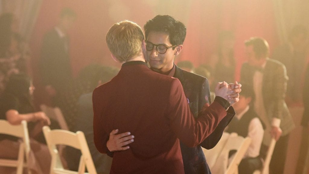 As well as lacking coming-out storylines, homophobic bullying is wonderfully absent from the show, as are any perceived struggles that come specifically from being gay. Every time you think the narrative may veer into that territory, it gleefully swerves away. When Seb seems to have stood up Carlos at Homecoming, you wonder whether it’s because he’s scared of how they’ll be perceived, only to find out that he’s three hours late due to a cow dying on his farm. On opening night, when Seb expresses to Carlos his nerves about his family seeing him as Sharpay, you worry that his family is homophobic, only for the camera to pan round to his large, embarrassing family waving pride banners.