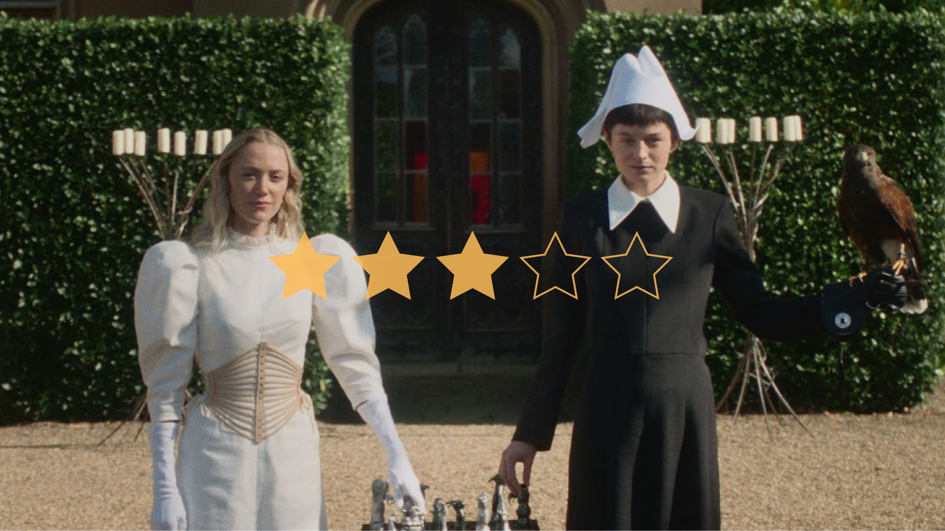 In a dystopic fairytale world where the patriarchy rules with brutality, Cherry (Maika Monroe) is recently and unhappily married to despicable royalty, Jerome (Amir El-Masry). Such is the abusive nature of this world that Jerome leaves Cherry alone for 100 days to test her fidelity, making a crude deal with his friend Manfred (Nicholas Galitzine). Monroe is effective as the meek wife, a woman accustomed to being quiet and told what to do, although the actor does not fully capture her growth that we see blossom by the end of the 100 nights. Star-of-the-show is Emma Corrin, who plays Cherry’s loyal maid Hero, and from whom comes the film’s fantastical tales.