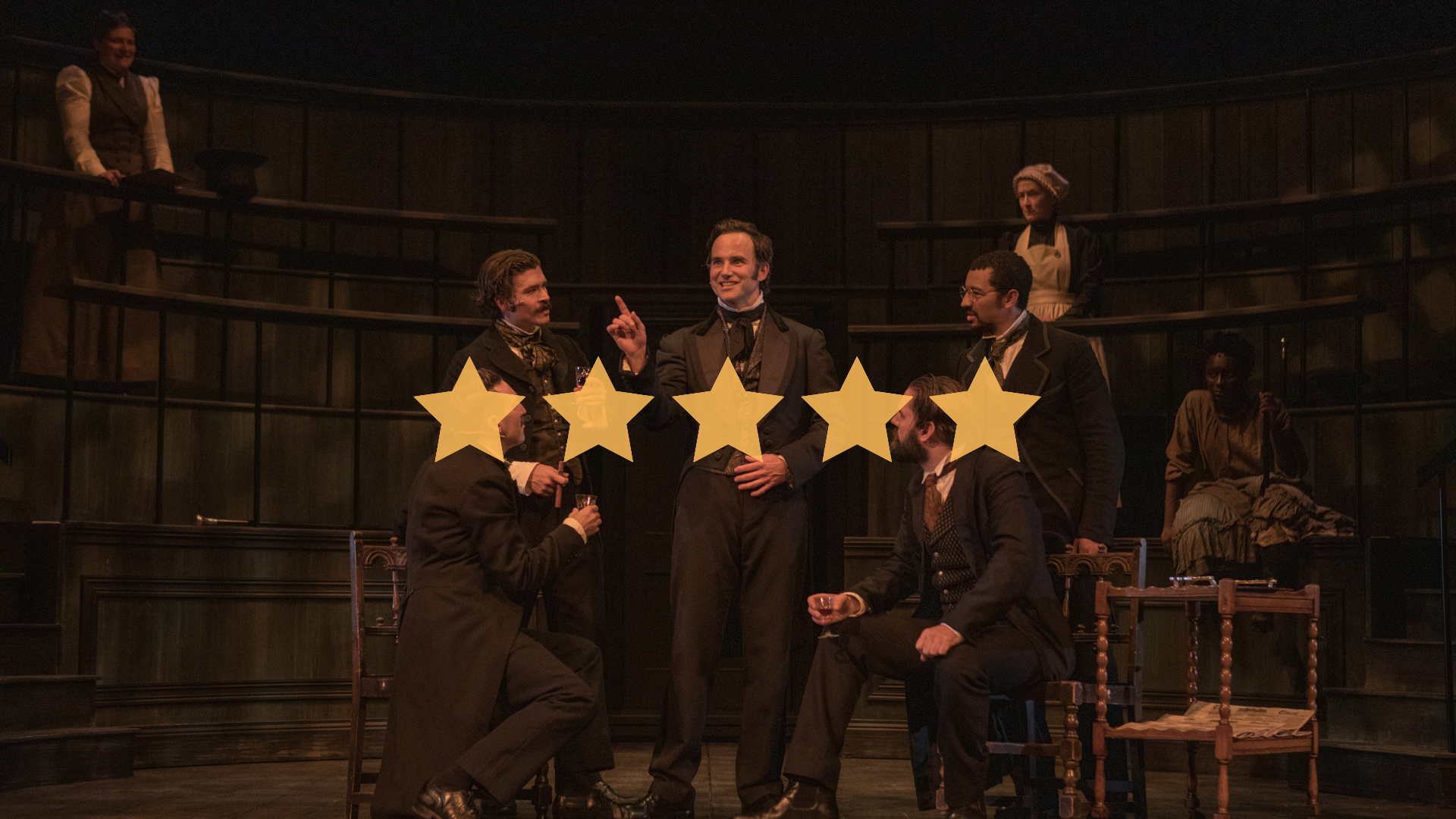 With that, we come to Dr Jekyll and Mr Hyde. Much as they have taken a back seat in this review so far, they are portrayed in the first part of the show as something of a looming spectre. They occasionally offer comments that the gentlemen hear and react to, but do not acknowledge. Nicholas Shaw, playing the two men, is able to change the way he acts as quickly as the wind changes direction. He navigates the transitions from Jekyll’s easy, upright stance to Hyde’s skulking, almost animalistic frame with ease, to the extent that if it weren’t for the fact he is onstage the entire time he could be mistaken for two separate actors. (The most effective thing about Shaw’s performance, however, is when during a final scene he is able to go almost a full two minutes facing the audience without appearing to blink. The effect is remarkably unsettling.)