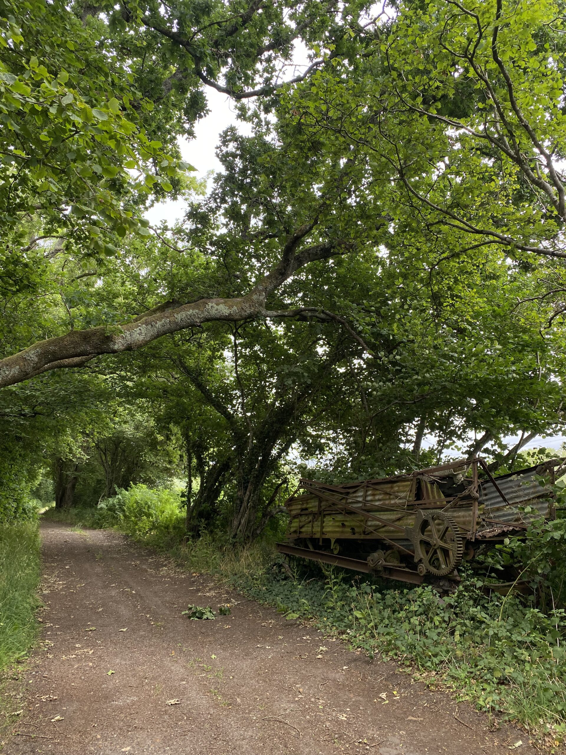 After this thirst quenching break of reflection, Frida and I continued into the unknown. Where we had previously been kept to footpaths, gnarled barbed wire on each side, this next section was large and open. Seas of tall fescue (soon to be hay) and cut golden fields rolled into one another, bordered by busy hedgerows and wonderfully green trees of every kind. In between the fields at one point we moved through a sheltered farmers track with its own leafy archway. At several points lay abandoned rusty farm machinery long forgotten. I took a minute at each one thinking about the days where they held up livelihoods and how even in disrepair they acted as trellises for burgeoning life.