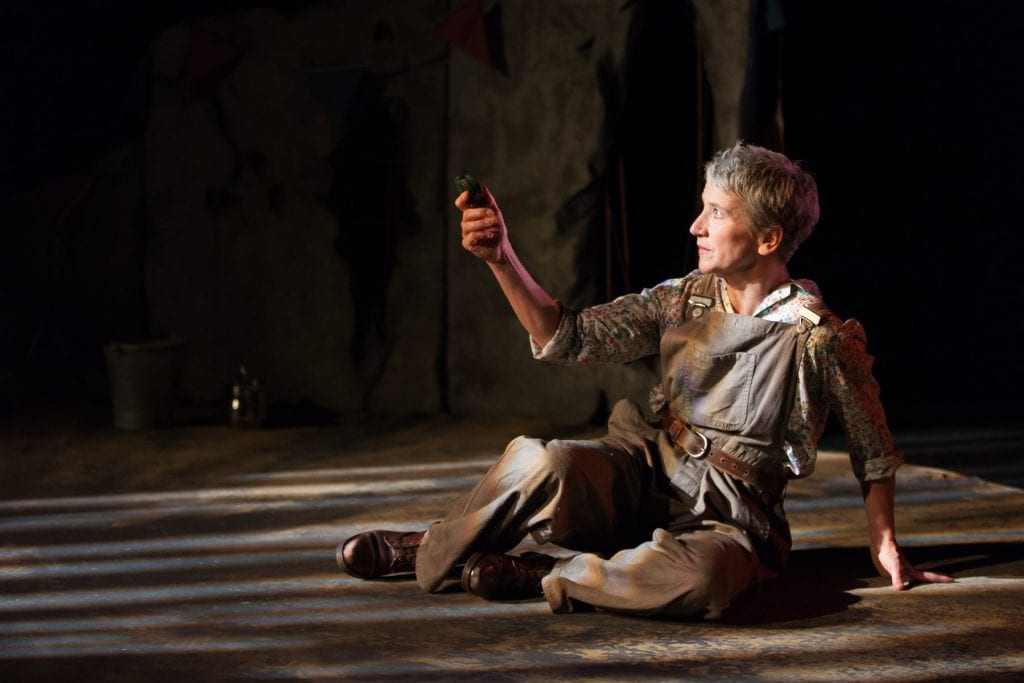 Despite being filled with a wealth of characters, An Elephant in the Garden is performed by a sole actress. Alison Reid plays Lizzie, who in turn plays her mother, a Canadian navigator, and an elephant to tell her story. Reid moves across the stage as an animated storyteller, with her older Lizzie slipping between characters in the story without warning. There is a marked difference between when she is narrating as older Lizzie and speaking as younger Lizzie: young Lizzie is filled with youthful hope for the future, while also clearly feeling the frustrations of an ongoing war, and older Lizzie tells the story with excitement, visibly happy to be sharing the story that changed her life.