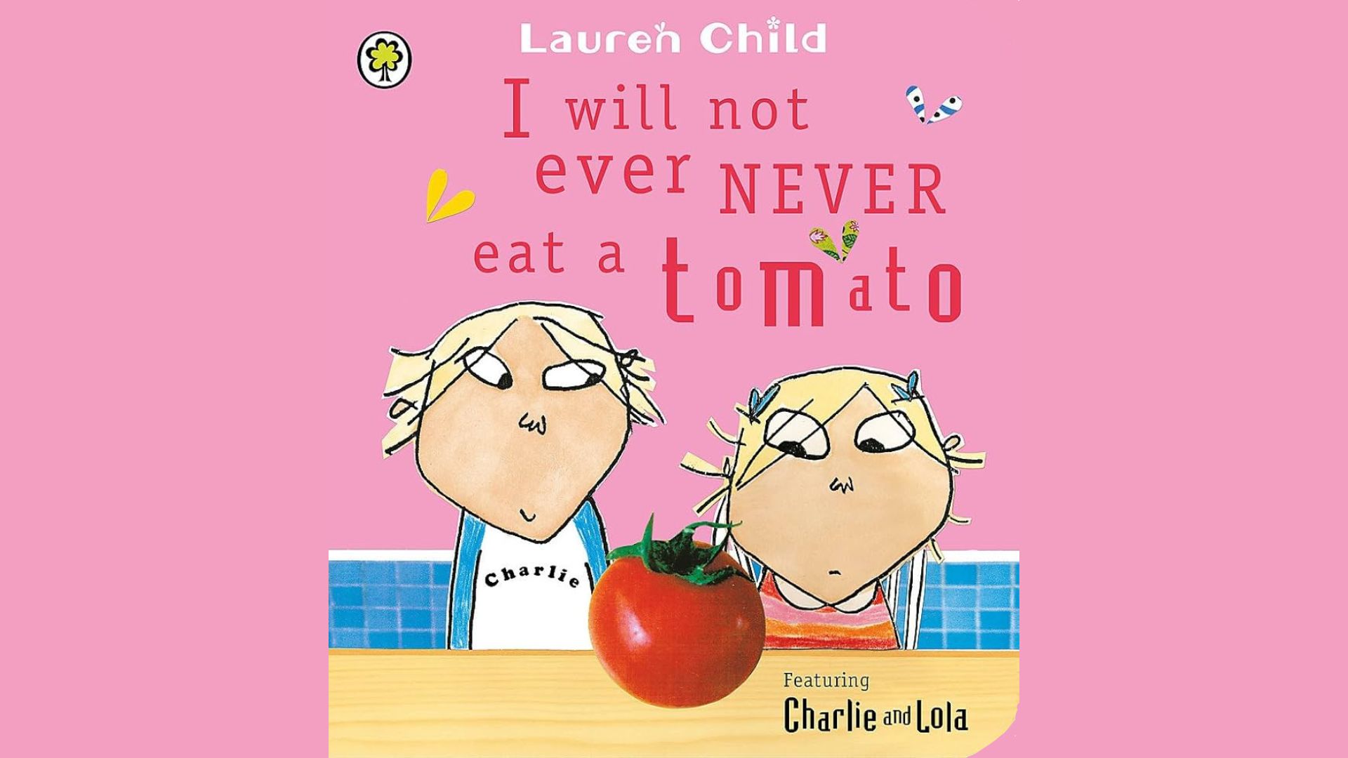 Written grammatically incorrectly on purpose, the title establishes Lola’s childlike voice. The story follows Lola being, as Charlie puts it, “a very fussy eater”, refusing to eat any of her vegetables due to reasons such as peas being “too small and too green” and carrots being “for rabbits”. To ease his little sister into trying these foods, Charlie tricks her by enabling her to use her limitless imagination, claiming these vegetables are “orange twiglets from Jupiter” or “green drops from Greenland”. These images are brought to life, as the illustrations picture Lola eating next to an alien from Jupiter and sitting on the peak of a mountain surrounded by clouds amongst other adventures. Additionally, shape writing is used to join this out-of-the-box imagery that both children have conjured in their minds. At the end of the story, Lola overcomes her fussiness, asking Charlie to pass her a “moonsquirter” – the tomato that she so vehemently refused to eat at the beginning of the story!
