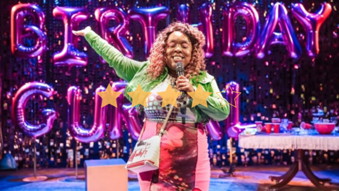 Director Odimba and designer Aldo Vasquez combine their considerable talents in the staging of the production. A row of magenta pink balloons spelling out, “Birthday Guurrl” are rearranged at notable moments throughout the performance, reflecting Lady’s changing moods and the fragmented state of the night. There is some confusion over a so-claimed spotless white carpet overrun with dirty dark smudges, and the appearance of a garish foil pigeon as Lady stumbles through the menacing streets of London alone detracts from a significant moment that could have used more room to breathe.