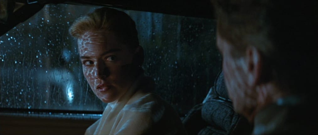 The characterization of the main characters is also handled well by Verhoeven, who is unarguably skilled at atmosphere-building, irrespective of your opinions on his films. We learn that Nick used to be an alcoholic and cocaine addict, and that he’s forced to undertake counselling sessions after he shot and killed two tourists, though the case was found to be accidental. Every past flicker of pain, every effort, every piece of temptation and self-loathing, is etched deep in Michael Douglas’ jowled face. His attraction to Catherine—her danger, her I-know-you’re-bad-for-me allure—makes him both loathe and want her. He breaks his sobriety after his first moment alone with her; he then has sex with his on-off girlfriend and counsellor, the doe-eyed Dr Garner (Jeanne Tripplehorn), which is consensual, but more rough than she would have liked. “You’ve never been like that before,” she says afterwards. “You weren’t making love.” Soon Nick and Catherine are even garbed in the same colours; dove-greys, beiges, whites, muted blues. The game becomes more dangerous, more confusing; Nick begins to spiral out of control.