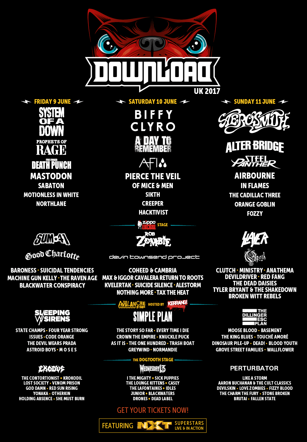 Convinced? Well you should be. I mean, that combination of the heavyweight power of SOAD, the fresh showmanship of Biffy Clyro and the absolute living legends of Aerosmith is something everyone can get behind. But…but if that’s not floating your boat then there is a lot more doing on around Donnington this year with headline performances from SUM 41, Slayer, The Dillinger Escape Plan, Wednesday 13, Sleeping With Sirens and the already mentioned Rob Zombie so enjoy!