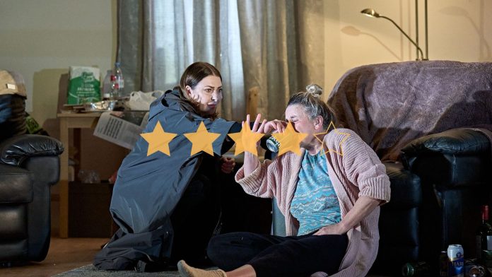 Kiera Clarke, a star of Derry Girls, is pushed to headline attention for The Dry House. (Indeed, there are nods to nuns here too.) But it is Mairead McKinley (of Translations) as Chrissy who carries the production; her fits of shakes and sweats shocking and difficult to behold. Her visceral description of wishing to ‘explode’ her young body onto her parents’ house – a firework, or something equally beautiful – starkly contrasts to her visions of the mangled mess of her daughter’s car-wrecked corpse.