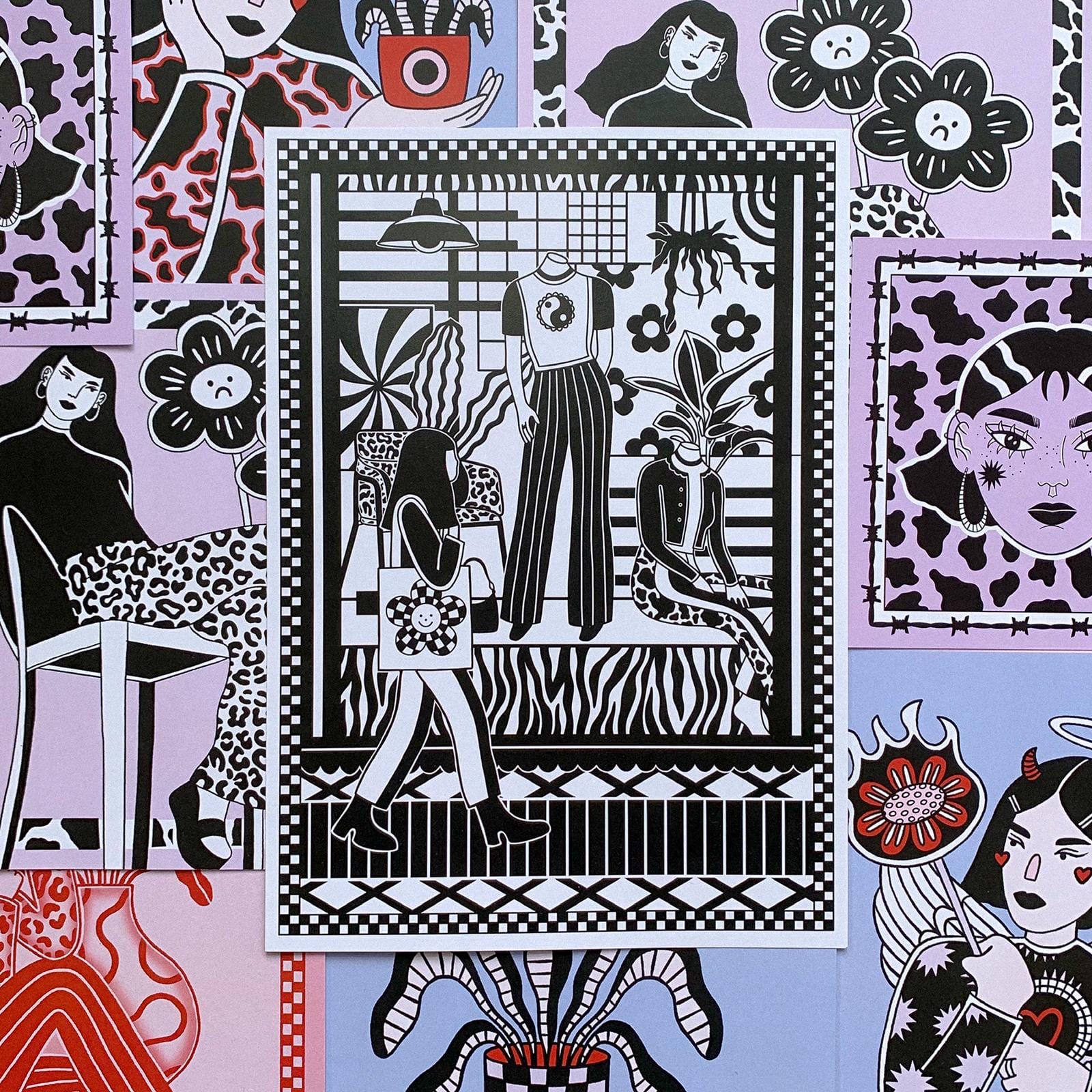 Although Eva Malley Art has a growing brand image and product range, her designs stem from her classic, retro black and white illustrations that have a modern twist. Animal prints, adorable smiling flowers that give off Takashi Murakami’s flower vibes, funky house plant galore and intricate facial features are Malley’s forte. She lets us in on where she gets her inspiration from: “I tend to base my work on how I’m feeling or who I’m surrounded by – a lot of it is based on my friends and women in my life,”