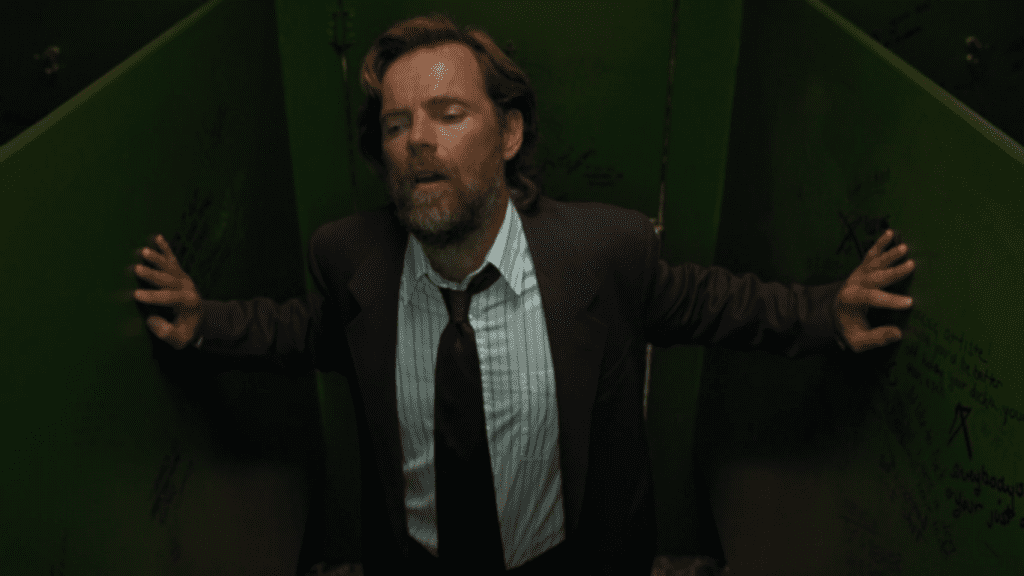 In the time ‘before’ the plot’s yet-unknown tragedy, the colour green features in luscious fields and family photographs. Post-tragedy, green appears to crudely light up murky fish tanks, neon lights in seedy clubs and is painted on dirty toilet cubicles that entrap characters at their most vulnerable. One relationship that is interesting to examine is that between Francis and Christina; it’s originally assumed that Francis is lusting after the dancer, who he pays for private dances – until we learn that she is his “angel” who he feels he must “protect,” for reasons that become clearer as the film progresses. The angelic imagery (her oversized white shirt, unbuttoned and flowing by her sides, function as wings) only bolsters the film’s religious symbolism, but also makes sense considering its philosophical tone.