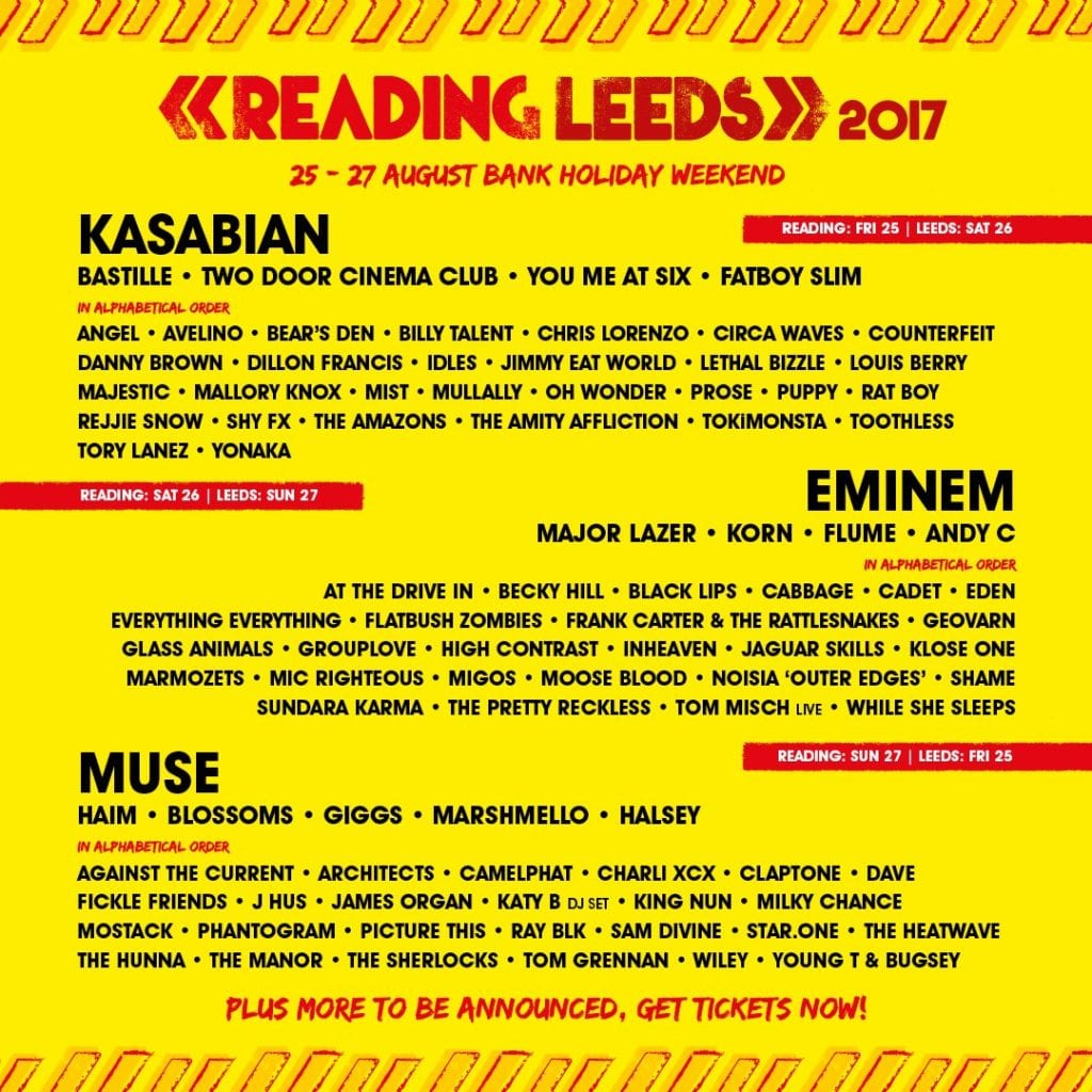 2017 sees Muse take over the Main stage on the Friday, Kasabian on the Saturday and Eminem on the Sunday. take to the stage, all who have performed at the festival before. Alongside the great headline acts, Leeds festival is set to welcome the likes of Fatboy Slim, Blossoms, Major Lazor and Haim to the stage. And if the big guns in music don’t tickle your fancy smaller stages such as Festival Republic, BBC Introducing and 1Xtra are bound to house the next big thing in the music industry.