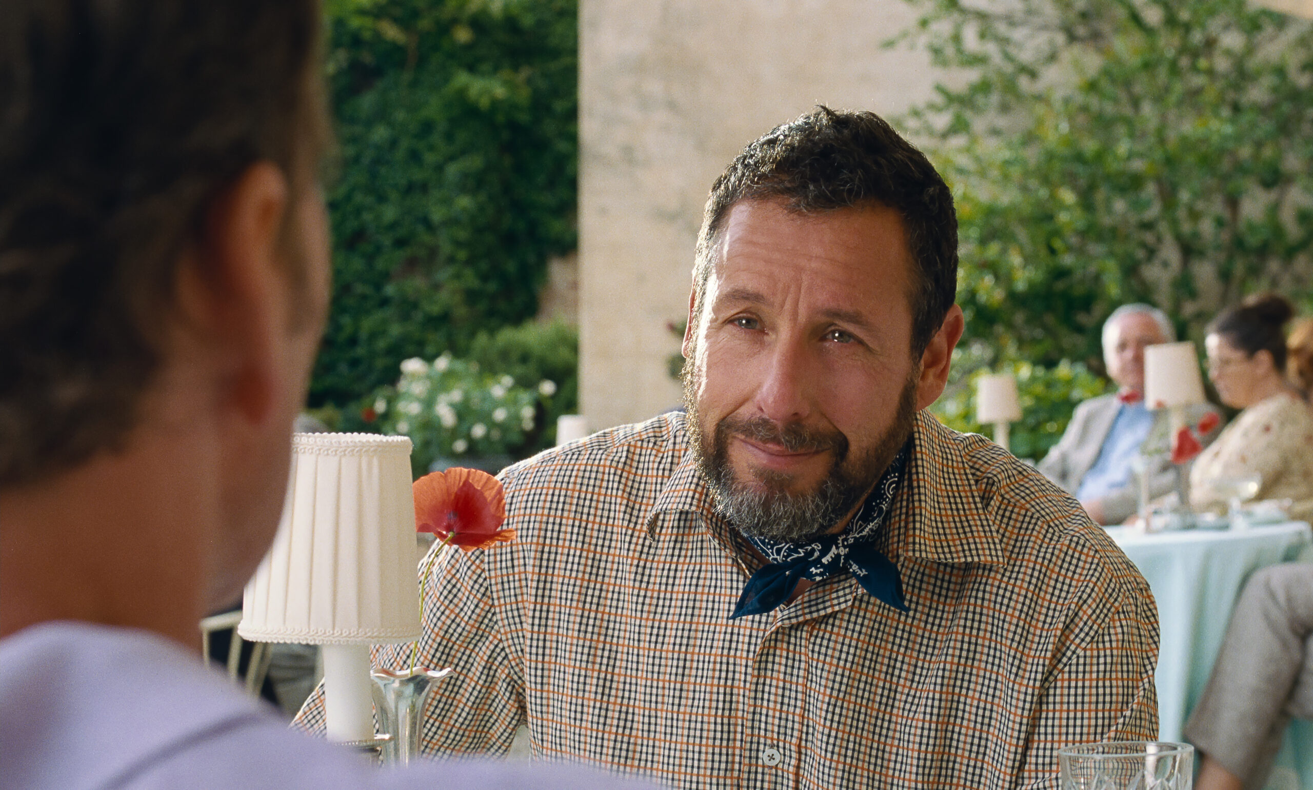 Tinseltown’s twinkliest silver fox, who last lent his honeyed baritone to Baumbach’s unflappably droll dialogue whilst voicing an actual fox back in 2009, is the titular Jay Kelly—a charismatic industry veteran whose beloved star persona allows him to brush off with a wink and a toothy grin more than a few accusations that all he does in his movies is turn up and ‘play himself’. Sound like anyone else you might know? We first meet Clooney’s Jay in pristine silhouette, illuminated from behind by the warm lights of an old-fashioned movie set. It’s a pointed introduction that comes hot off the heels of an epigraph from Sylvia Plath: “It’s a hell of a responsibility to be yourself. It’s much easier to be somebody else or nobody at all”. Indeed, if Jay is a man famous for pretending to be other people, recognisable simply by his shadow, it’s telling that for pretty much everyone in his off-screen life, from his long-suffering manager (Adam Sandler) to his two daughters, it often seems as though there’s nothing there behind the mask.