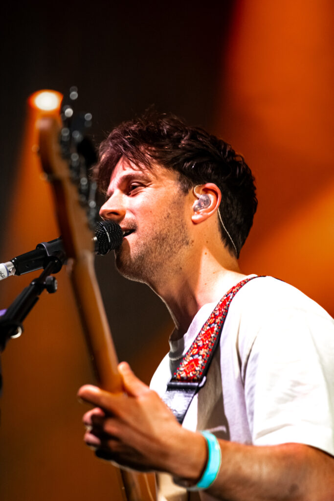 It was a profoundly sweet moment – totally unpretentious and heartwarming. It was clear through the night that these boys were friends, and the music they made came from that place: each track embodies that pure, unadulterated glee of gallivanting with your mates on a hot summer’s day, all blue skies and laughter and energy. By the aptly named fourth track ‘friends’, everyone was singing along and whistling along with Ellis, Cotterill and Leff. ‘Loosen Up’ – a sun-drenched earworm from the older 2019 album Replica – was freshened up with new instrumentalisation: bongos, which added a bouncy Caribbean flair. ‘Vitamin’ was also made groovier, with extra snare drums and bright, preppy guitar riffs becoming more distinct. These samba influences were a nice nod to Ellis’ childhood – growing up with an extensive collection of Afro-Caribbean records, which his father had brought back to the UK from Zambia. They gave the performance an added depth and showed how the band had matured and progressed musically while still staying true to their easy-going, outdoorsy sound.