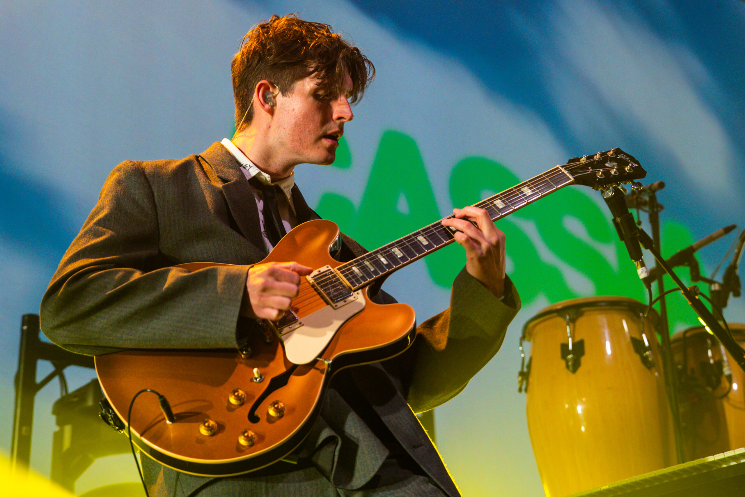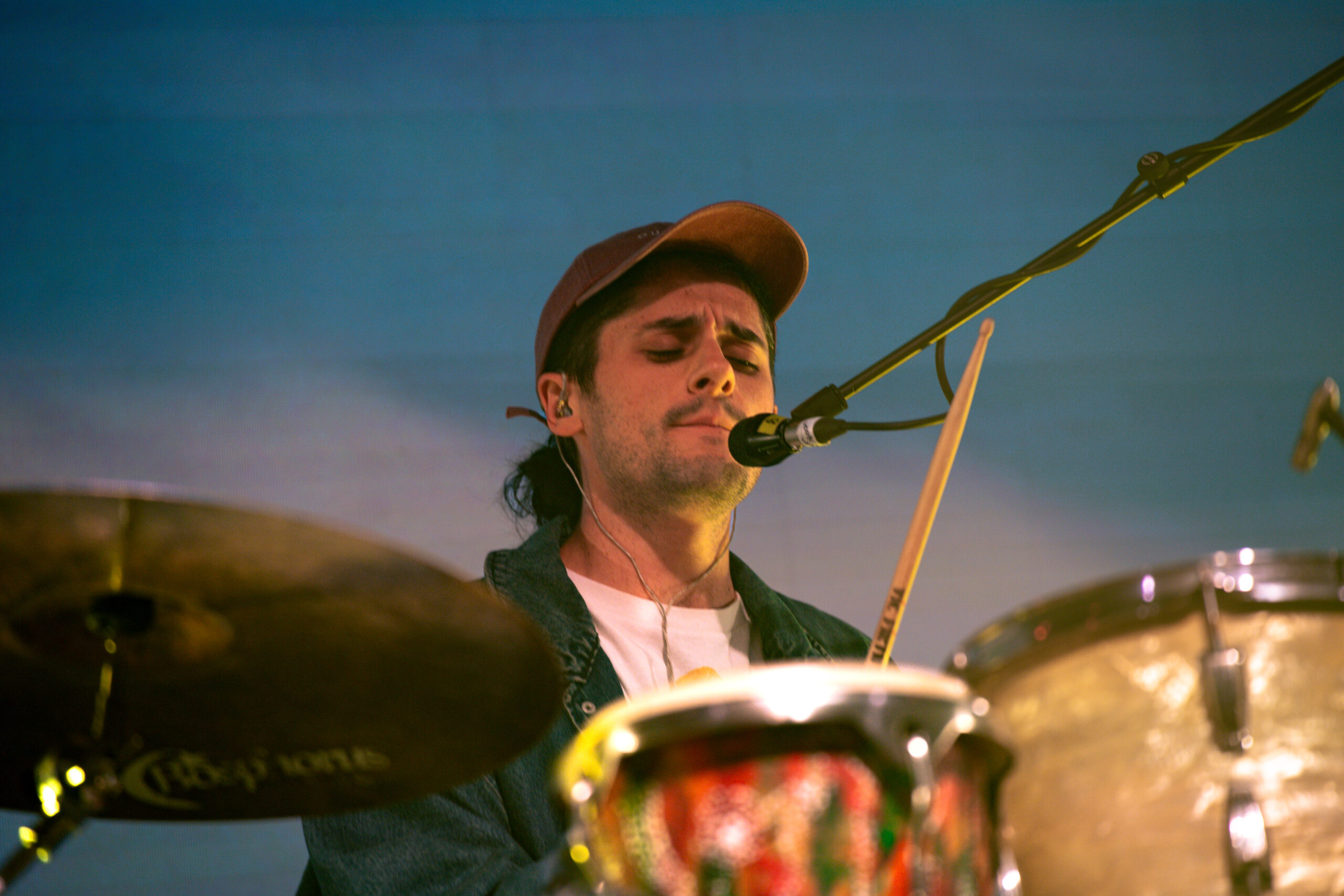 It was a profoundly sweet moment – totally unpretentious and heartwarming. It was clear through the night that these boys were friends, and the music they made came from that place: each track embodies that pure, unadulterated glee of gallivanting with your mates on a hot summer’s day, all blue skies and laughter and energy. By the aptly named fourth track ‘friends’, everyone was singing along and whistling along with Ellis, Cotterill and Leff. ‘Loosen Up’ – a sun-drenched earworm from the older 2019 album Replica – was freshened up with new instrumentalisation: bongos, which added a bouncy Caribbean flair. ‘Vitamin’ was also made groovier, with extra snare drums and bright, preppy guitar riffs becoming more distinct. These samba influences were a nice nod to Ellis’ childhood – growing up with an extensive collection of Afro-Caribbean records, which his father had brought back to the UK from Zambia. They gave the performance an added depth and showed how the band had matured and progressed musically while still staying true to their easy-going, outdoorsy sound.