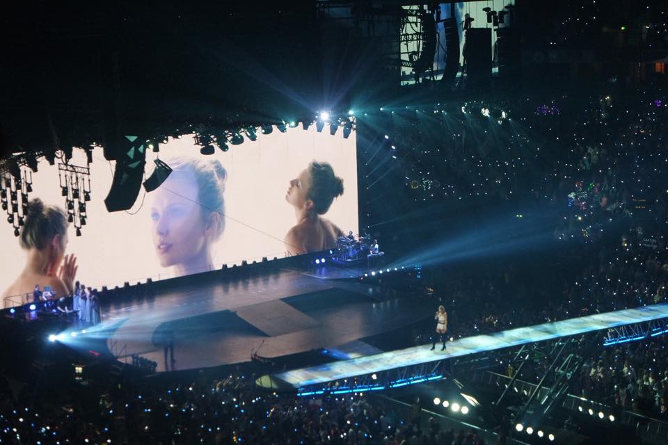 After a surprisingly slow, acoustic, almost background music-like set from her support act Vance Joy, Taylor Swift took to the stage to the tune of 15,000 screaming fans at Manchester Arena. Before the show, a sort of unspoken competitiveness had descended on the arena as the most dedicated and over-excited audience members (including myself) eyed up one another’s efforts to attract the attention of Queen Tay and her assistants in the hope of gaining a pass to the most prestigious meet-and-greet in the industry, Loft ’89. The Taylor Swift cult of all things sparkly and feline was certainly evident in the choice of outfits, poster slogans and the use of fairylights as a standard accessory. This lit up every corner of the arena and, with the addition of light up bracelets for everyone, created the feel of an illumination show rather than a pop concert.