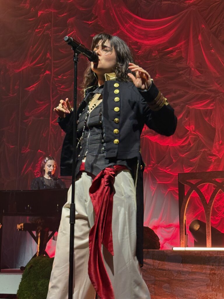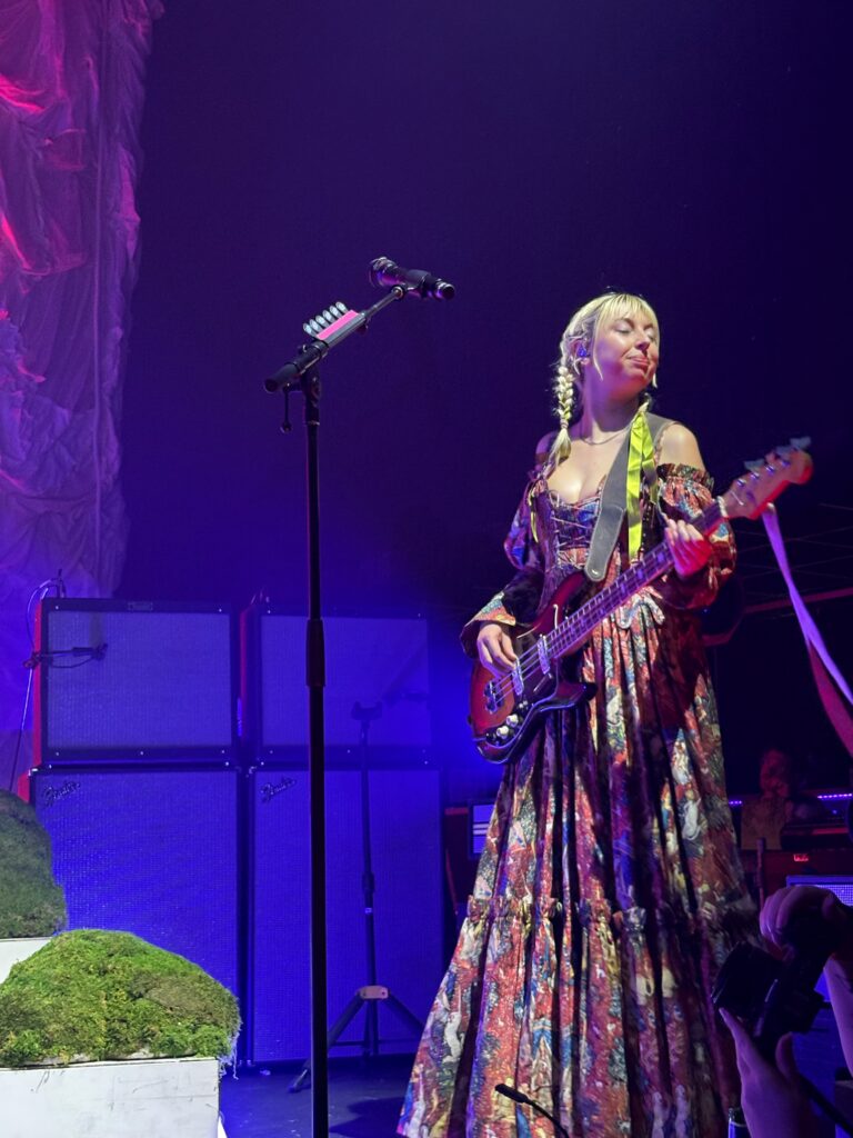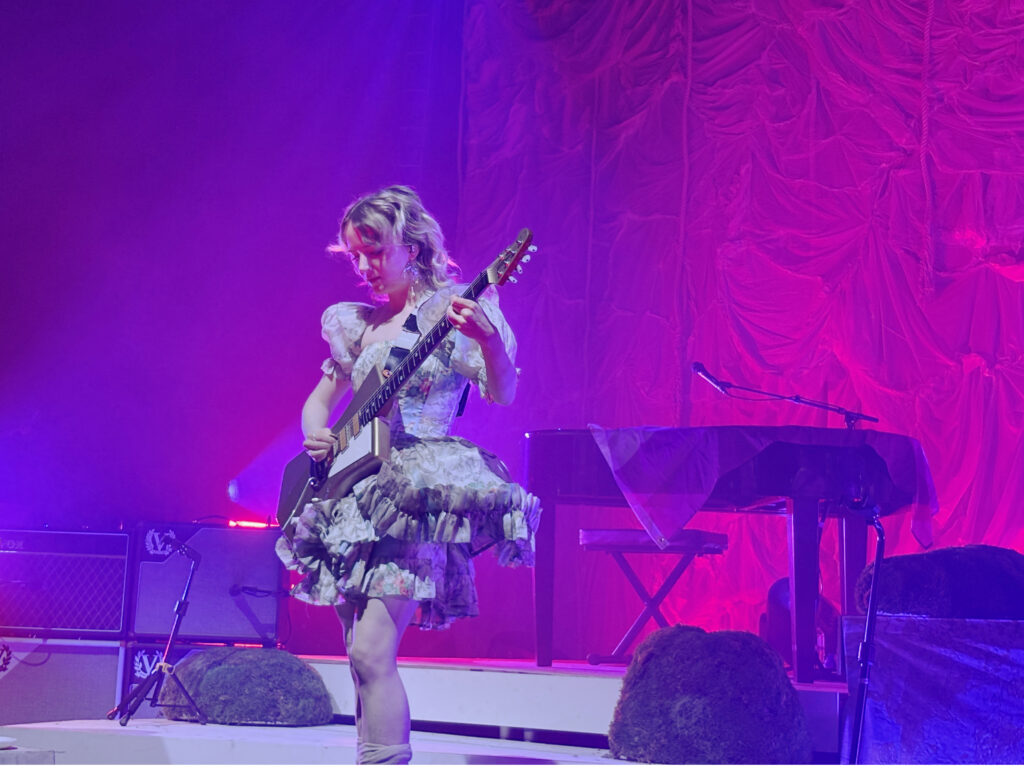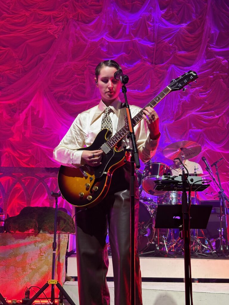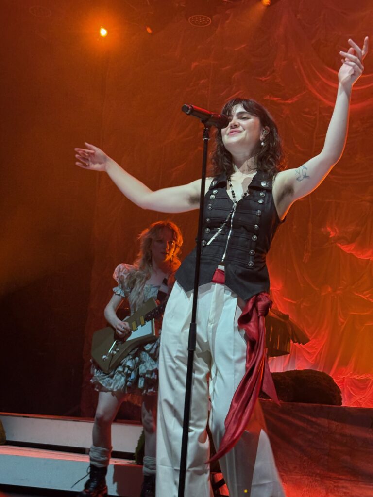 ‘Count the Ways’ followed, with its own theatrics: Roberts and bassist Georgia Davies stood shoulder-to-shoulder at the rear while Morris, with a falsetto flourish, leaned against Aurora Nishevci’s piano. During the song, a fan in the pit passed a lesbian pride flag to Morris, who smiled, waved it proudly, then laid it across the piano.