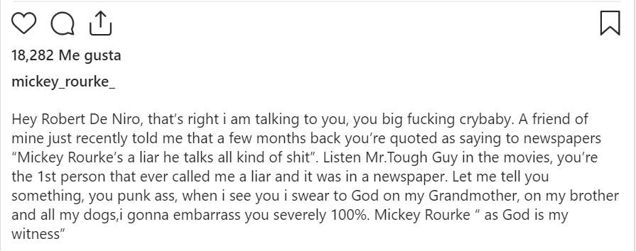 In the Instagram post, Rourke says to De Niro – who Rosenfield claims is “aware of these comments” – that he is “the 1st person that ever called me a liar and it was in a newspaper [sic]”.