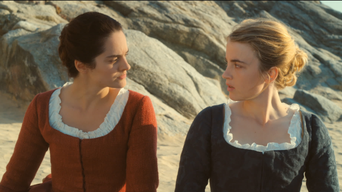 It is easy to get carried away with all of this rich language, and it might convince you that this film is too pretentious or in love with itself to be taken seriously. This is not the case, and the main reason for that is the two central performances from Merlant and Haenel, which are key to grounding the story in believability. The emotions of love and longing are rich, but the performances are anything but calm or collected. Both of these women are guarded people who take a long time to open up. They stumble over each other, and even though the film consistently looks stunning and effortless, the performances instead emulate an awkwardness that captures the reality of anxious connection within the beautiful look of the film. A lot goes unsaid, and both leads capture this through their body language. Their stances are insular, and they each look unconfident in their burgeoning realisations of love.