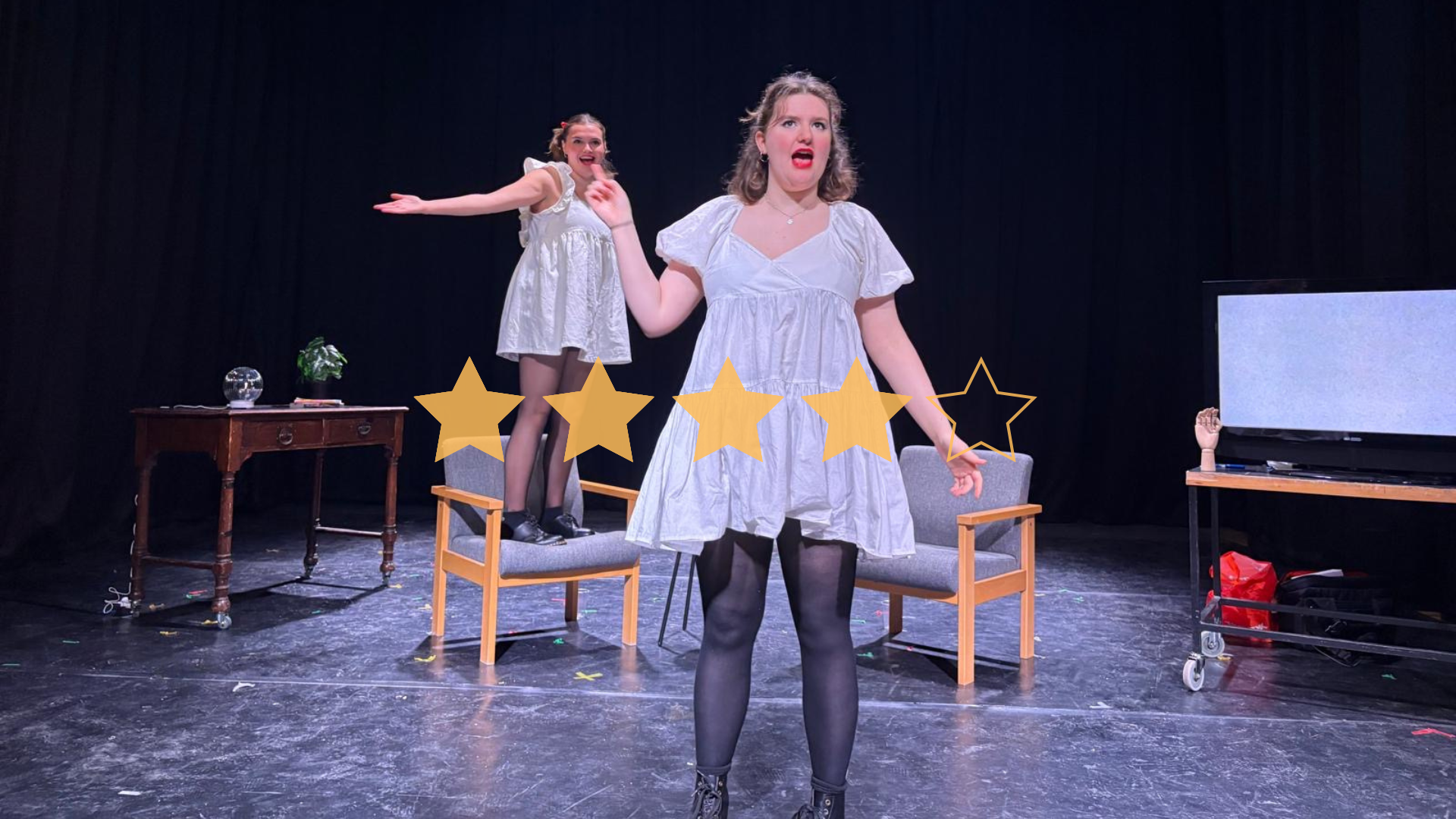 Think radical. Think promises you can keep. Think two female politicians interviewed on their policies on live TV. Think the only logical solution to society’s problems. Ban men. That’s right: Agnes and Maud are ahead of you. Minotaur Theatre Company’s I’m Not Saying We Should, But What If We Did? oozes satire from the off. It is a fizzing, immersive, energetic show that douses you in parody but doesn’t pull its punches when it has you exactly where it wants you.