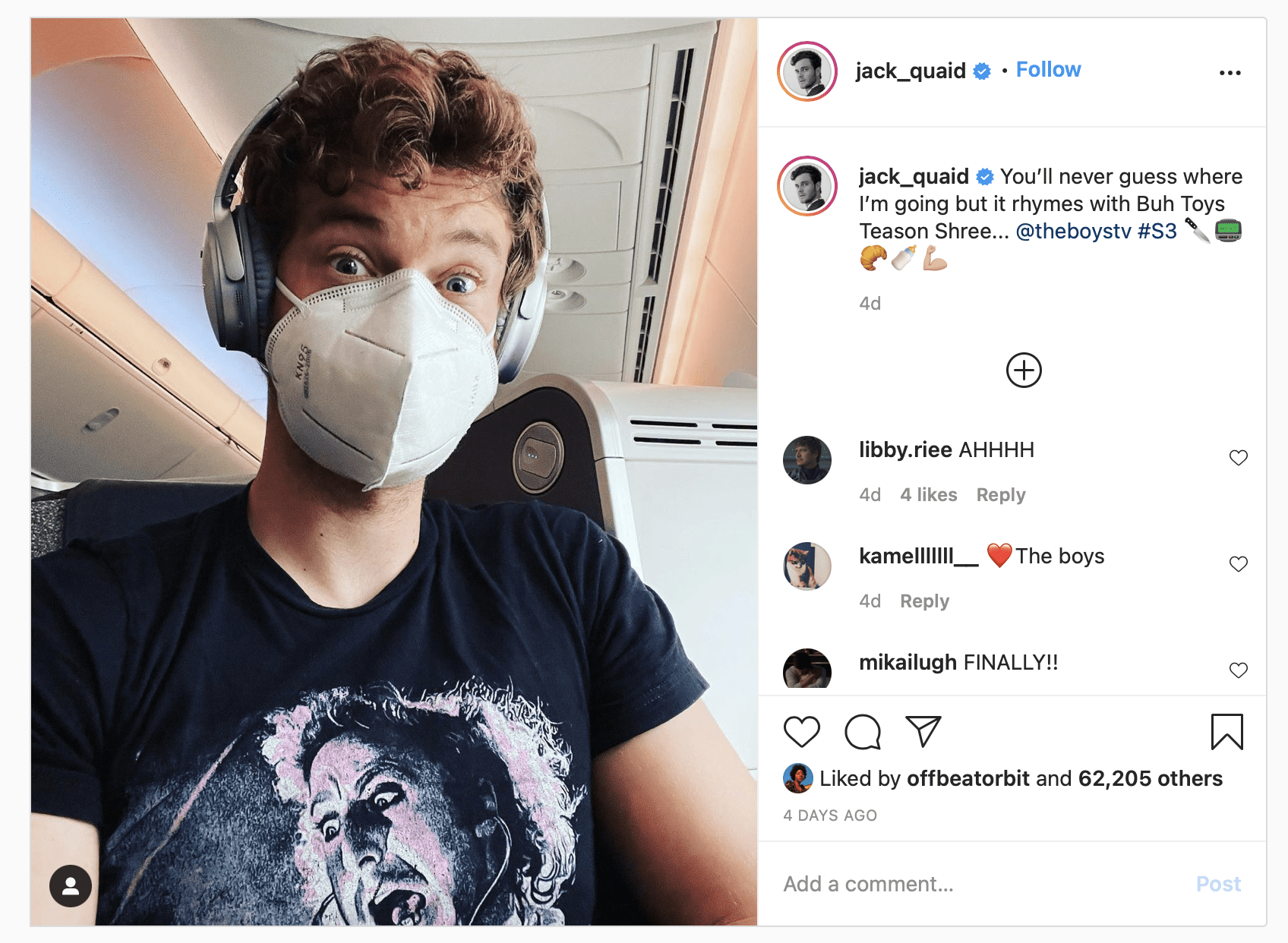 On January 5th, Jack Quaid, who plays Hughie (the somewhat hapless member of the ragtag group of ‘boys’, who pit themselves against the pride-swollen Supes) posted on Instagram with the caption “You’ll never guess where I’m going but it rhymes with Buh Toys Teason Shree… #theboystv #S3″