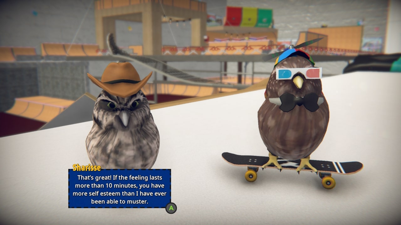 After just an hour with the game I knew I was safe. It turns out, a game about skateboarding birds is pretty damn funny. But that humour might not last you the entire run-time.