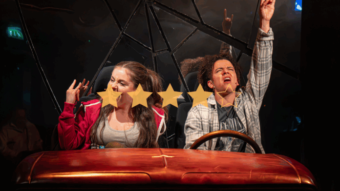 It may be small but Emma Susanne Lloyd’s direction utilises every inch of the space available in The Other Palace. The car set piece in particular is utilised as multiple different settings aside from its original purpose. The small space works in favour of the piece as it gives it an intimate feel and allows the audience to feel as if they are really immersed in Sam’s mind. Lloyd takes advantage of this with the careful curation of moments when Sam directly addresses the audience and when she pulls back and is less revealing of her feelings. The one element that does feel somewhat hampered by the space is the choreography. Lauren Stroud works well with what she has and huge dance numbers wouldn’t fit the show, but you can’t help but feel that she would have been able to do slightly more with the movement in a larger space.