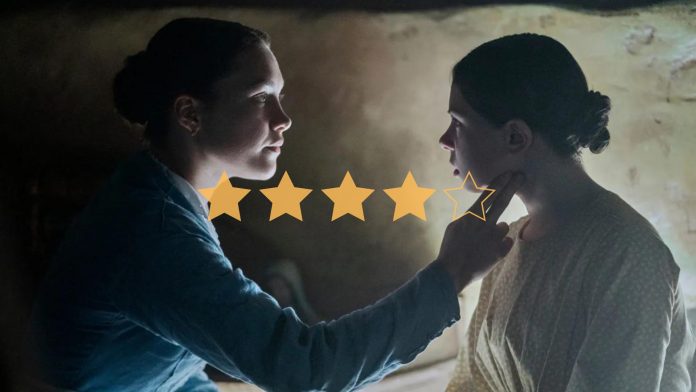 For a period drama, Lelio’s adaptation of Emma O’Donoghue’s The Wonder, starts in an unusual place. In fact, the film opens on the most contemporary of settings, a soundstage in the present day. A voiceover lends reason as to why this is, inviting us to suspend our disbelief in a story that is inherently linked to our ability to do so. It’s a story about stories, you see, and there are multiple truths about to play out as our protagonist seeks to uncover the real one. The camera then pans to a set of a ship, on which our main character, English nurse Elizabeth Wright (played by the ever-brilliant Florence Pugh) makes her way to Ireland knowing very little about what she is to encounter there.