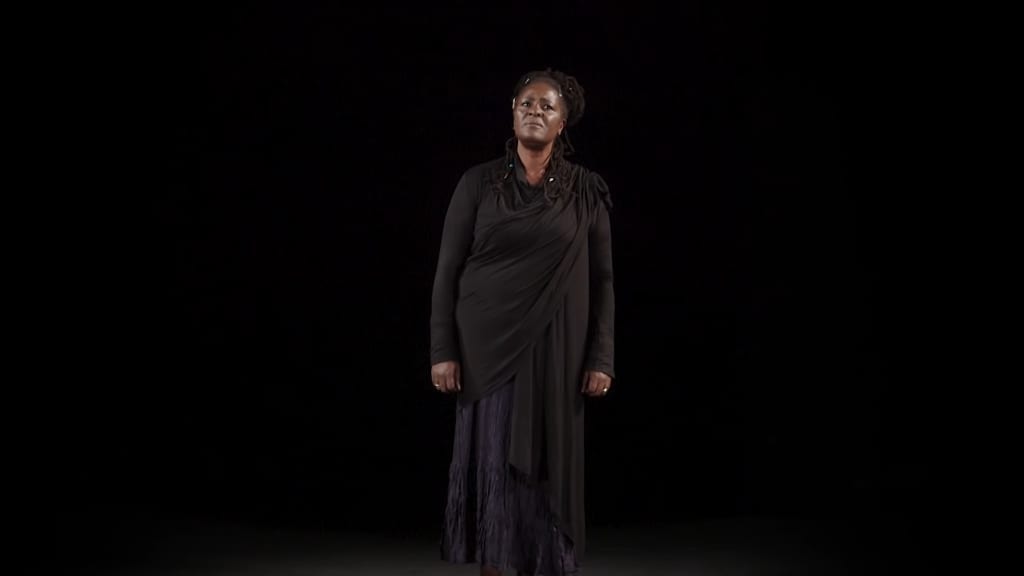 The stage is dark and empty, with Sharon D. Clarke stood alone; she speaks directly to (in this case) an imagined audience. The simplicity and emptiness of this set was quite representative of the loneliness and confusion that many individuals have felt in during the social, medical and political turmoil of this year. To reflect this further, Sharon D. Clarke is dressed in black, appearing as though she is in mourning. Her black cloak creates an almost goddess-like figure, perhaps comparing 2020’s events to that of a Roman or Greek tragedy.