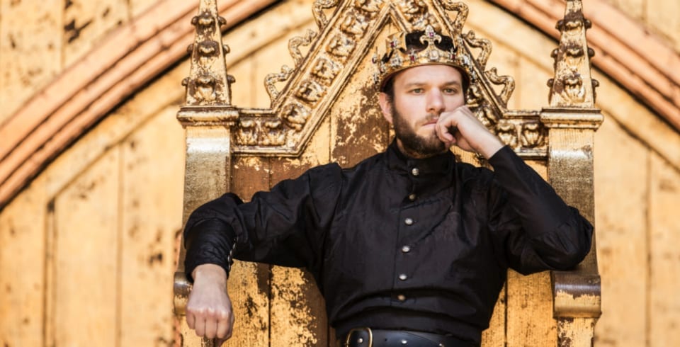 Now, these humorous aspects would make for, at best, a middling play which latches onto comedy in order to convey plot with no real depth through which we can witness the downfall of a king. However, Edwards brings a stunning vulnerability to the role, truly embodying the transformation Richard undergoes. Most notably, toward the beginning of the play, Richard stands on the upperstage with his arms outstretched, commanding respect and exuding power. Then, after he is forced to resign the crown, he gives an impassioned speech bidding farewell to his kingship, in which the audience become an extension of the courtiers who are sat listening on stage. Later, he appears from the trapdoor, sitting hunched and visibly wounded in the Tower of London.