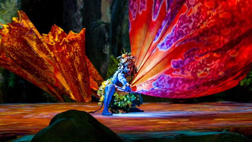 I struggle to praise this production’s creative team enough; in particular, the costume and makeup designer, Kym Barrett, and the set designer, Carl Fillion. When you watch this production, it feels as though you’ve actually managed to poke your head through the screen on your laptop and entered the enchanted world of Pandora. Indeed, the set certainly feels magical, shifting between rivers, streams of fire and the truly mesmerising Tree of Souls without effort. Dare I say, the costumes and makeup look even more real than the, admittedly superb, animated puppets from the original film? Indeed, I do. Everything about the set, the props and, of course, the performers, is constructed to feel as though you have stepped through into an alien world.