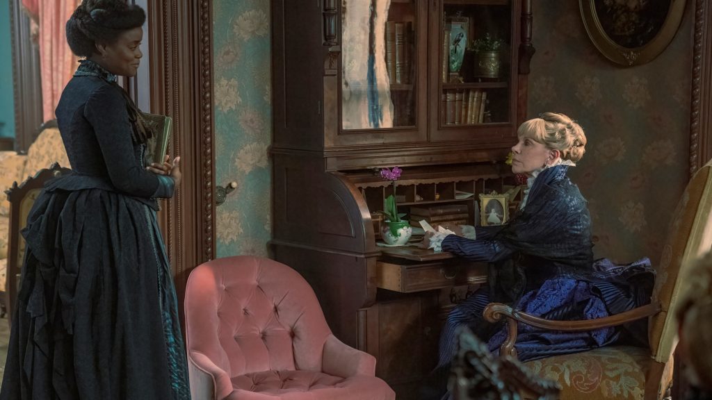 In echoing back to what makes The Gilded Age so brilliant, albeit different from its spiritual companion Downton Abbey, is Fellowes’ commitment to providing entertainment above all else. With the stiff upper lip of Britain not being of concern for writer Fellowes, the American setting allows for a more nuanced and casual approach to production and an embracing of the tackier elements that would make Dame Maggie Smith’s Violet Crawley sneer. Even in the home of the Rhijn-Brook family, the more conservative individuals portrayed by Cynthia Nixon and Christine Baranski, the costume remains pantomime-esque and regal. Further, and similarly to Downton, Fellowes’s attention to the lives of the staff allows for a more accurate and less rose-tinted view of a time period that notoriously favoured the upper class.