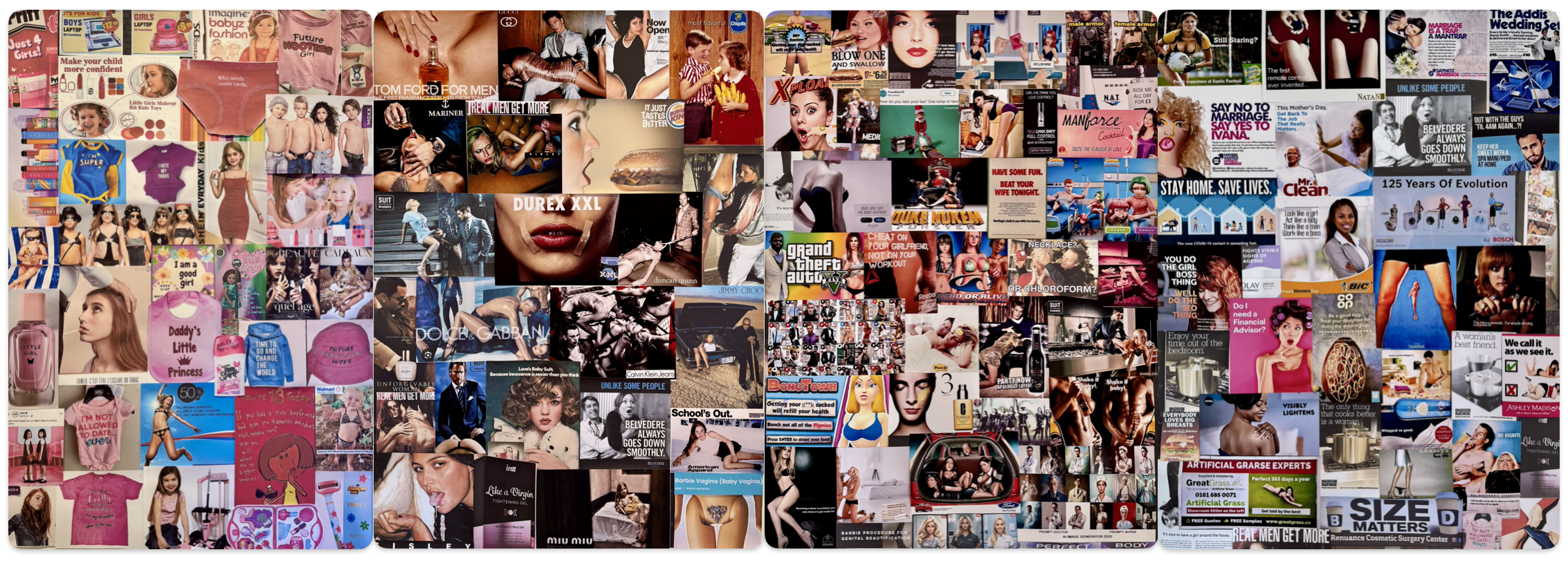 Page became interested in the evolution of the images that she was collecting, and was horrified at the progression from innocent, almost laughable, sketches of the 1960s to the influx of darker, graphic images at the turn of the millennium. Household names, such as Calvin Klein, Burger King, and Ford are littered throughout the scene in nearly every major industry, demonstrating the breadth of the problem which she is addressing.