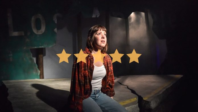 Latham is intoxicating, attentive to the sustained monologue and her inflamed performance. She moves about Amy Jane Cook’s post-apocalyptic set like a game of hide-and-seek, often peeking through cracks and around jagged corners. When she ‘transforms’ into a wolf, we understand her wild fury: “Eyes turn yellow. Fur springing out all over me and the fangs snapping out from my gums”. But there is also a control to Maxine’s untethered existence of neglect, violence and the tendrils of love—at least in the way her story is told.