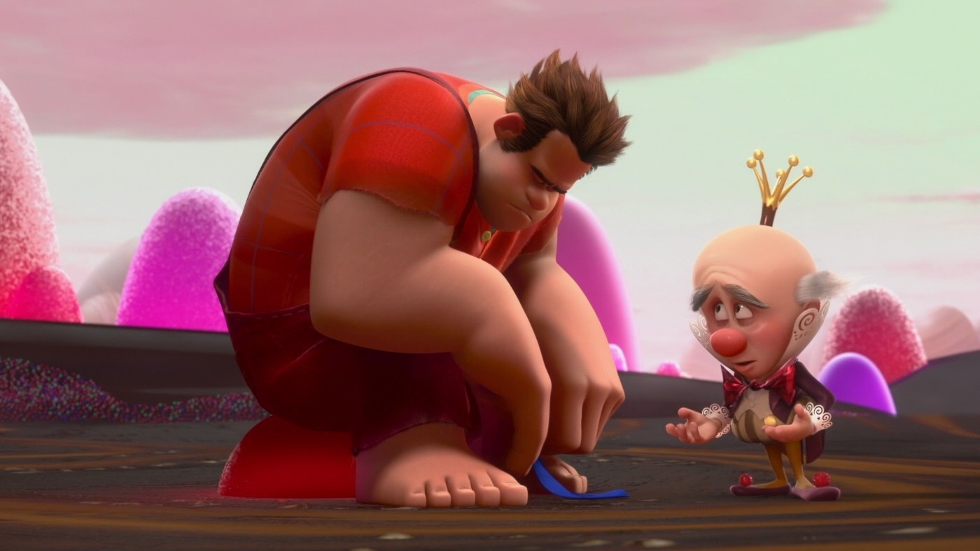 When we are introduced to King Candy, the Mad Hatter–esque ruler of the game Sugar Rush, his menace is in short supply. His goofy, clown-like movements accompanied by Alan Tudyk’s exuberant vocal performance make him a figure of fun rather than fright, and his sharp visual contrast to Ralph makes him appear pathetically overpowered. The only trace of Turbo visible in him is his vigorous gate-keeping of his game, which could easily be coincidental. Simply put, he seems to be of no real threat.